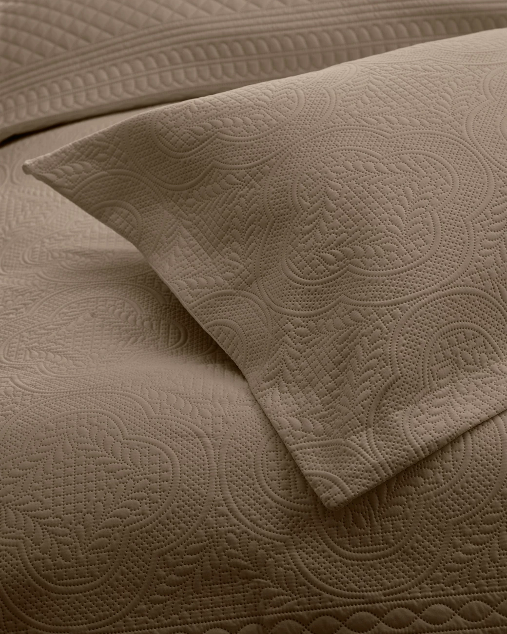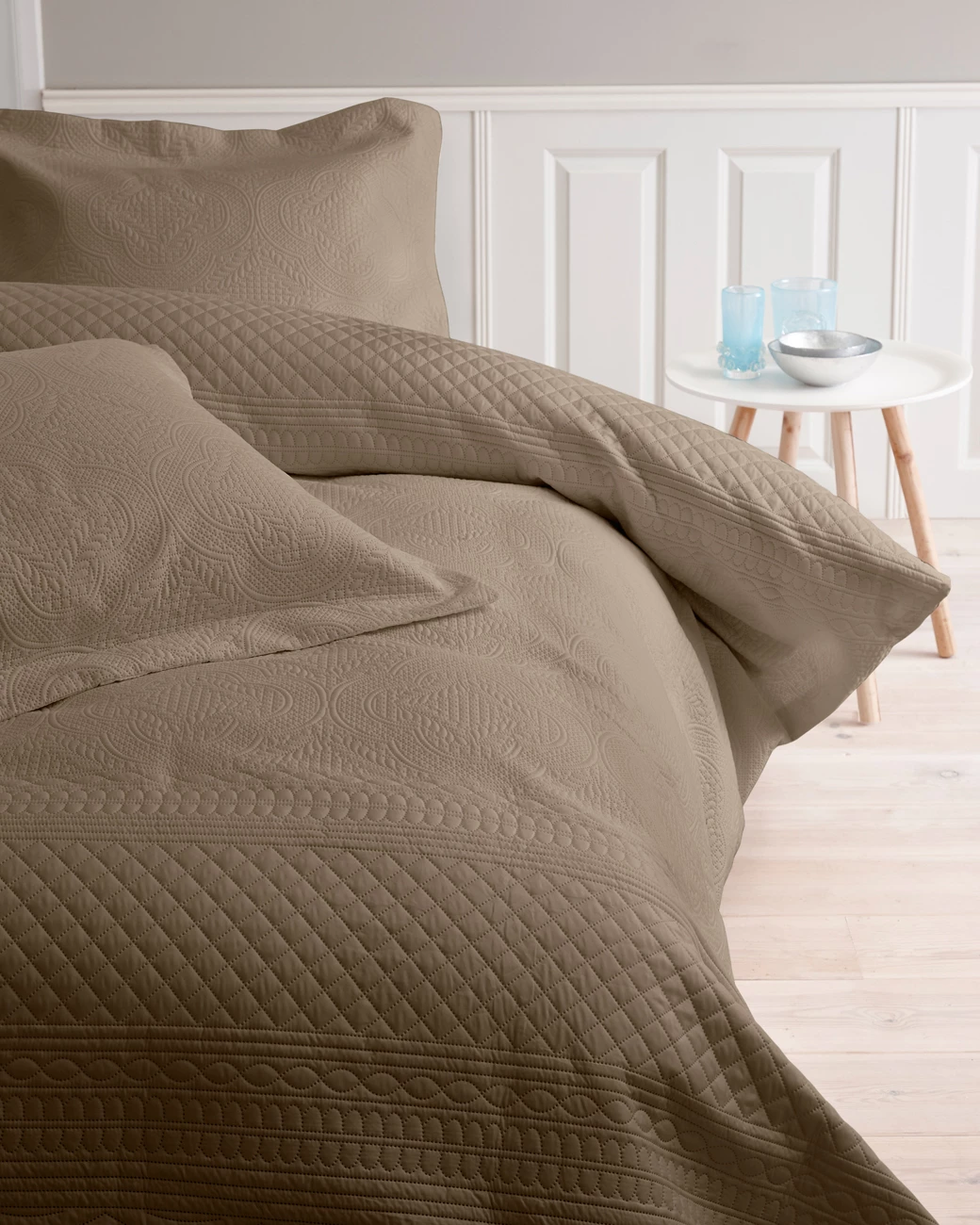 Maastricht Beddensprei TaupenBescherm u beddengoed eenvoudig tegen vuil en zonlicht met de Maastricht sprei in de kleur Taupe. Deze sprei is voorzien van een sierlijk motief en is uitgevoerd in de kleur taupe, dit geeft een zachte warme uitstraling aan de kamer. De afmetingen van de Maastricht beddensprei zijn 260 x 250 cm.nnStijlvol en luxueus zachtnDe sprei is een stijlvolle en luxueuze toevoeging aan je slaapkamer. Deze sprei is een absolute must-have voor een elegante uitstraling. Gebruik hem niet alleen ter bescherming van uw beddengoed, maar ook als decoratief element om de uitstraling van uw slaapkamer compleet te maken. De sprei is verkrijgbaar in verschillende kleuren, zodat u zeker een variant vindt die past bij jouw interieurstijl.nnGemaakt van heerlijk zacht materiaalnDeze chique sprei is vervaardigd van micropercal. Dit materiaal voelt heerlijk koel aan, is zacht en soepel, en neemt vocht goed op. Dankzij deze stof geniet u keer op keer van een comfortabele nachtrust en kunt u extra lang van je sprei genieten.
