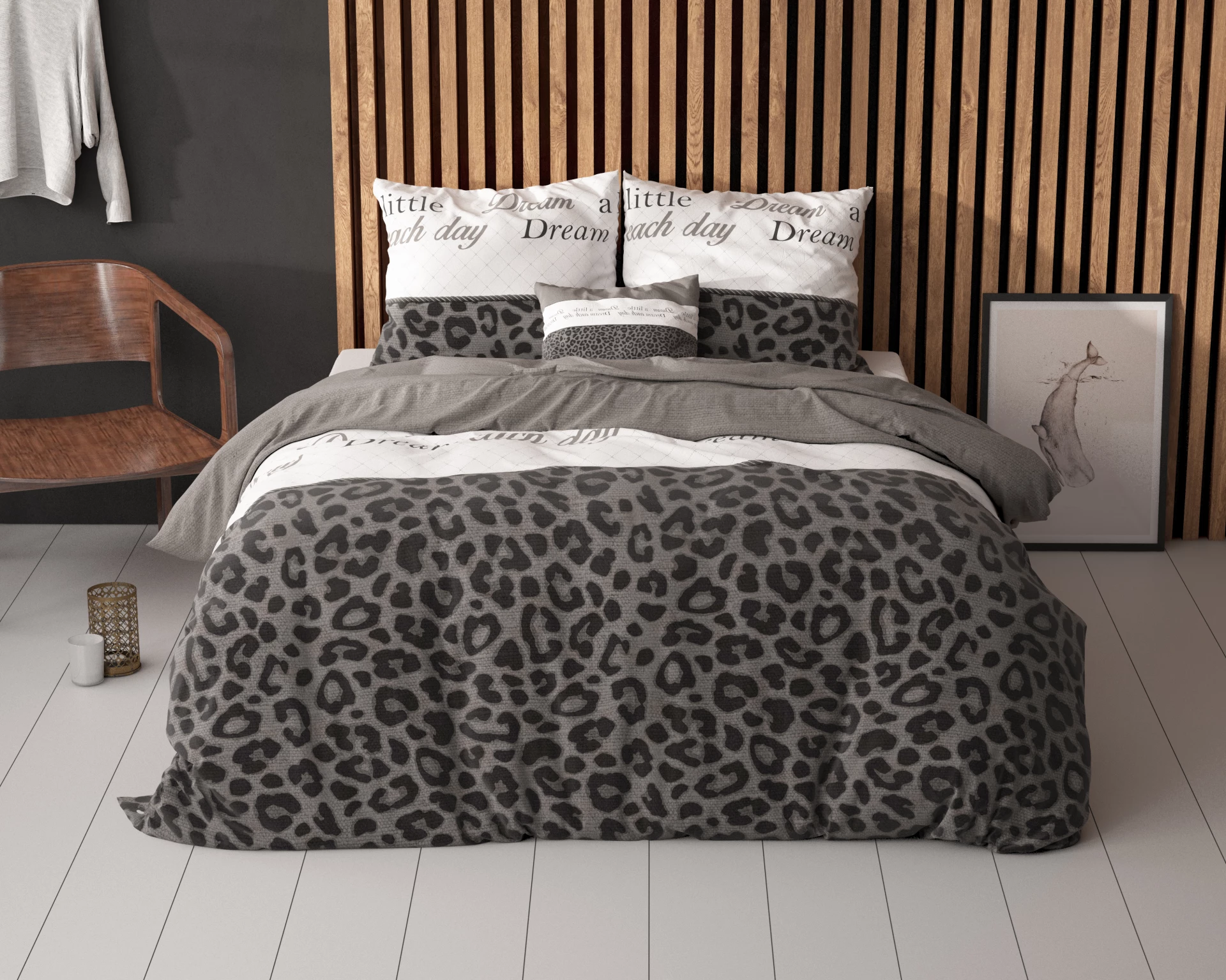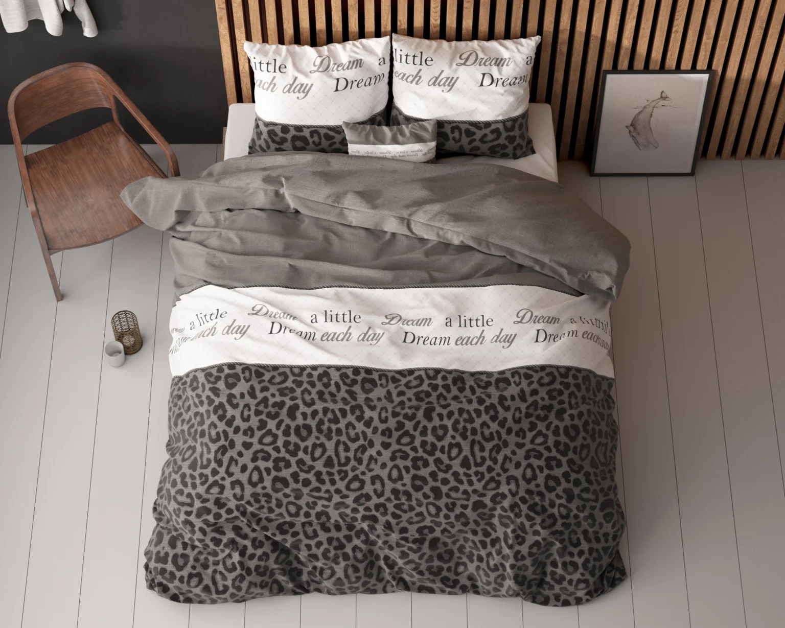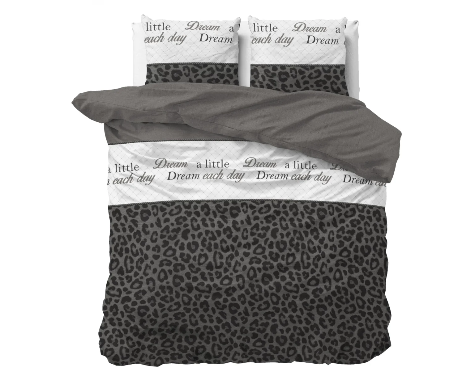 Dompel uzelf elke avond onder in dit trendy en comfortabele Dekbedovertrek Apeldoorn Antraciet. Aan de ene zijde heeft het overtrek een stoere en gedurfde panterprint, terwijl de andere zijde effen is. Het overtrek is ook versierd met woorden als ‘Dream’ en ‘Sleep’. Het dessin is ook te vinden op de kussenslopen. Maak het plaatje compleet door de dierenprint te combineren met een effen wit, grijs of zwart hoeslaken. Het dekbedovertrek heeft een totale lengte van 220 cm en sluit gemakkelijk met drukknopen.