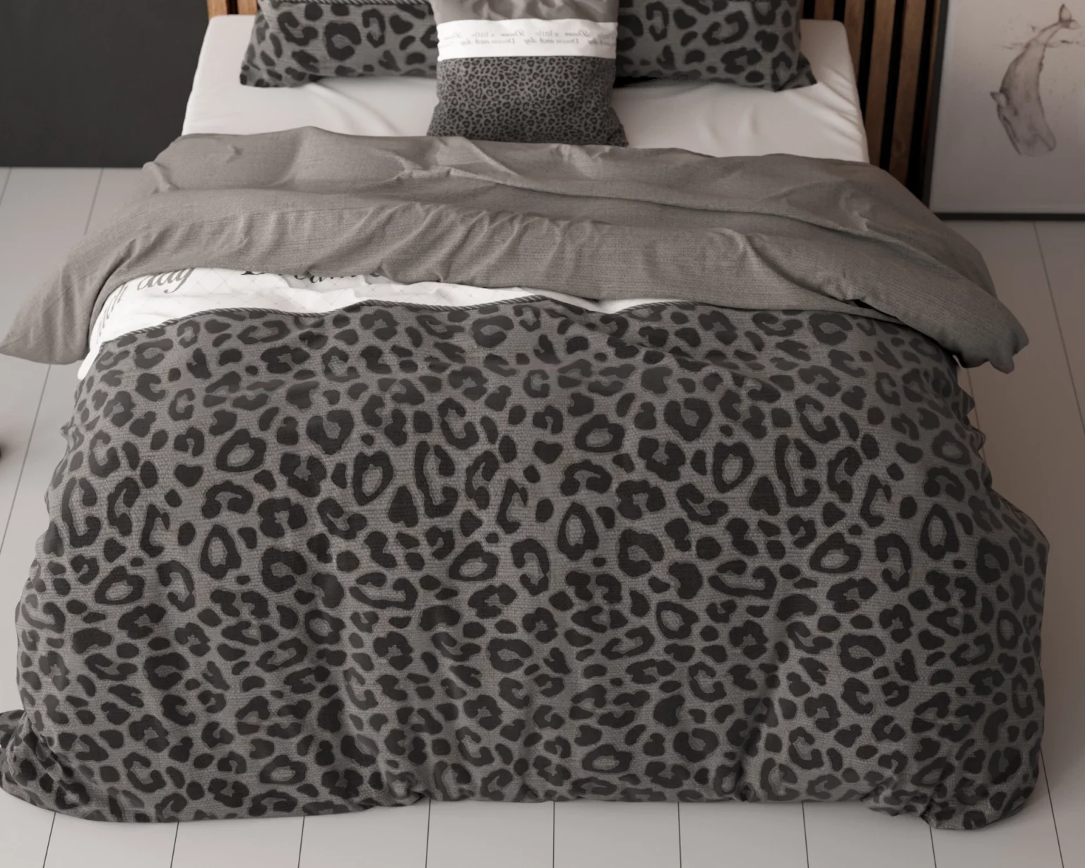 Dekbedovertrek Apeldoorn AntracietnEr is niets beter dan na een drukke en vermoeiende dag in slaap vallen onder een comfortabel dekbedovertrek. Geniet van het knusse gevoel van het Dekbedovertrek Apeldoorn Antraciet, dat gemaakt is van een mix van katoen!nnStijlvol en comfortabel Dekbedovertrek Apeldoorn AntracietnDompel uzelf elke avond onder in dit trendy en comfortabele Dekbedovertrek Apeldoorn Antraciet. Aan de ene zijde heeft het overtrek een stoere en gedurfde panterprint, terwijl de andere zijde effen is. Het overtrek is ook versierd met woorden als ‘Dream’ en ‘Sleep’. Het dessin is ook te vinden op de kussenslopen. Maak het plaatje compleet door de dierenprint te combineren met een effen wit, grijs of zwart hoeslaken. Het dekbedovertrek heeft een totale lengte van 220 cm en sluit gemakkelijk met drukknopen.nnGemaakt van hoogwaardig katoenmixnHet Dekbedovertrek Apeldoorn Antraciet is gemaakt van duurzame materialen. Het bestaat namelijk uit 80% katoen en 20% polyester. Dankzij deze combinatie voelt het overtrek zacht aan, is het soepel en reguleert het de warmte. Het dekbedovertrek is warm, droogt snel, kreukt nauwelijks en gaat lang mee. Bovendien heeft het een dubbele, doorlopende instopstrook.