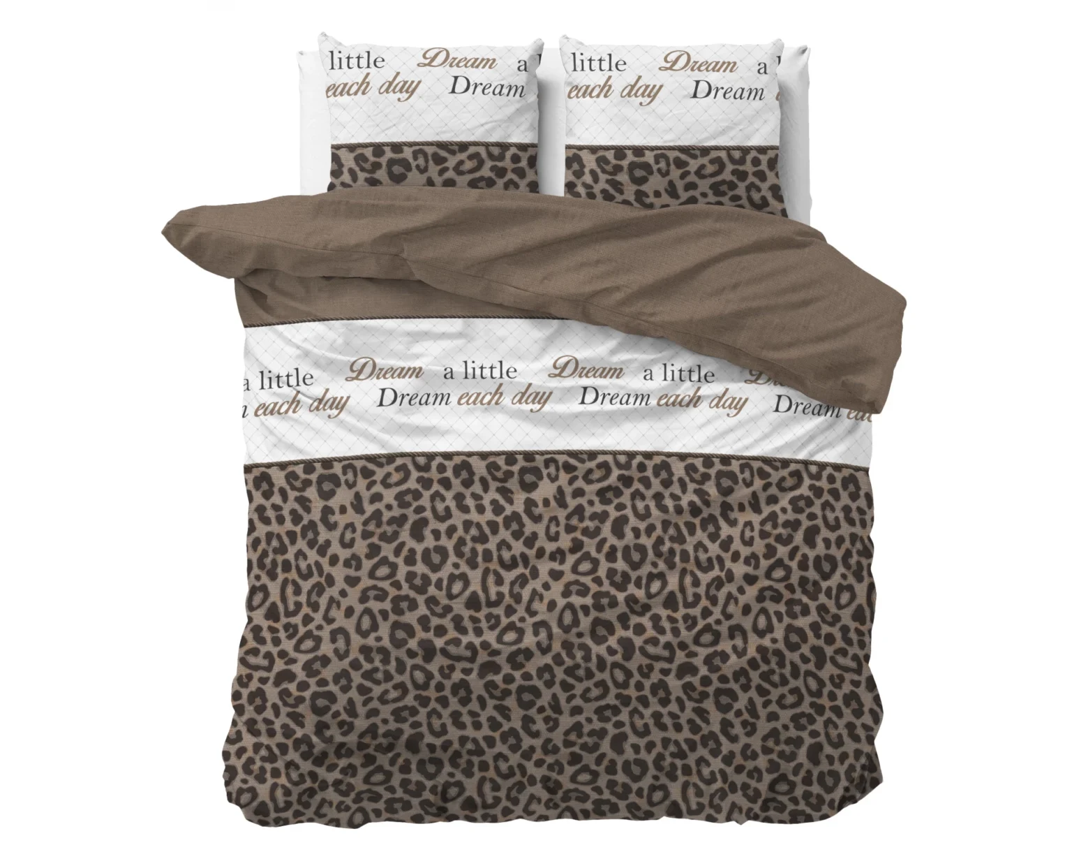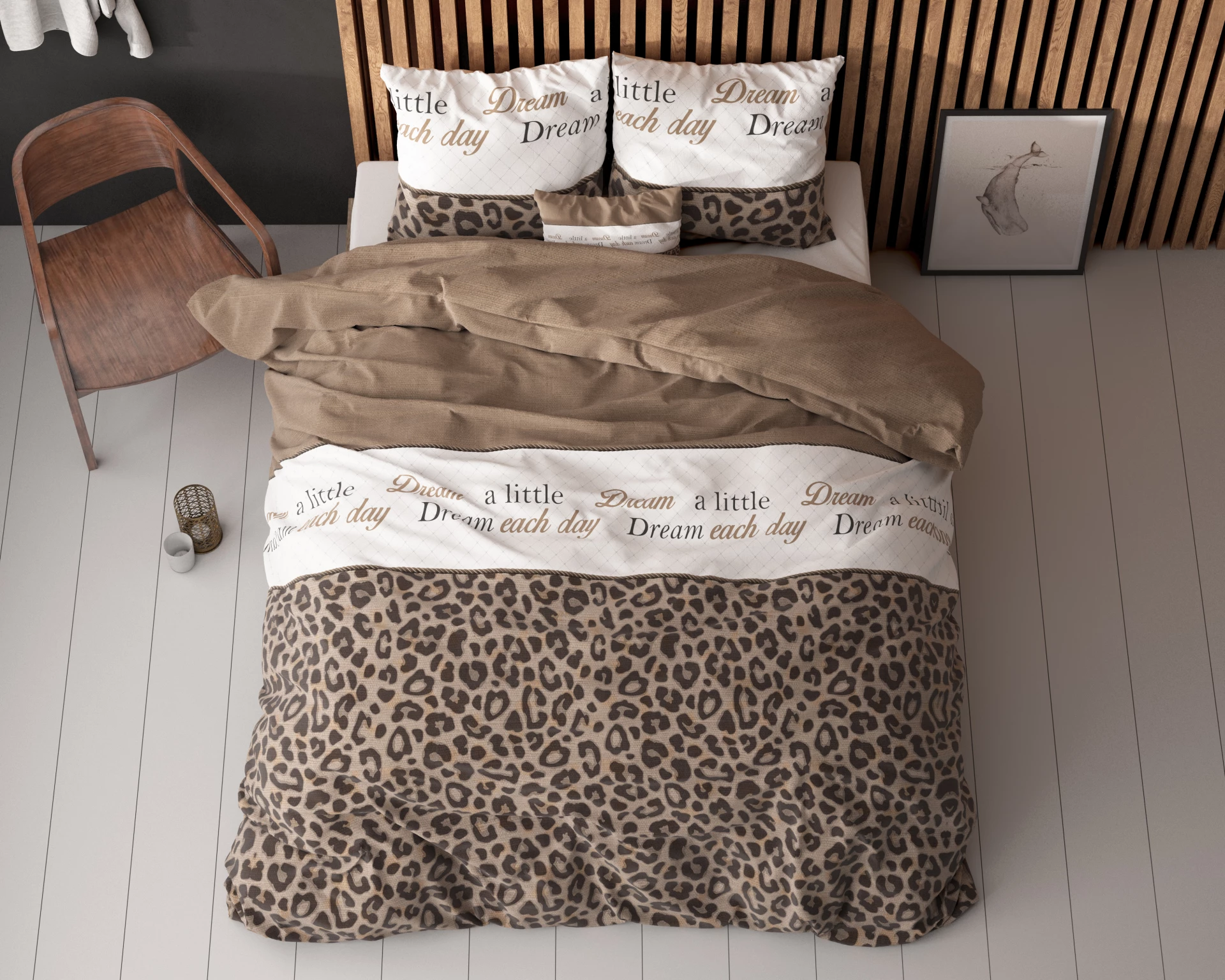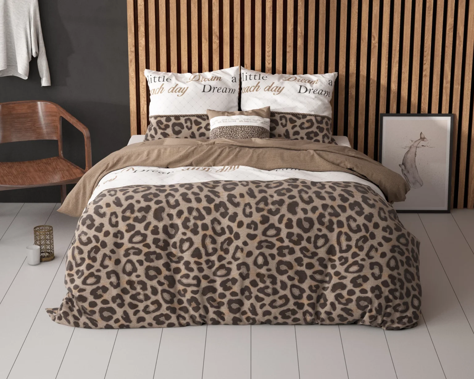 Dekbedovertrek Apeldoorn TaupenEr is niets beter dan na een drukke en vermoeiende dag in slaap vallen onder een comfortabel dekbedovertrek. Geniet van het knusse gevoel van het Dekbedovertrek Apeldoorn Taupe, dat gemaakt is van een mix van katoen!nnStijlvol en comfortabel Dekbedovertrek Apeldoorn TaupenDompel uzelf elke avond onder in dit trendy en comfortabele Dekbedovertrek Apeldoorn Taupe. Aan de ene zijde heeft het overtrek een stoere en gedurfde panterprint, terwijl de andere zijde effen is. Het overtrek is ook versierd met woorden als ‘Dream’ en ‘Sleep’. Het dessin is ook te vinden op de kussenslopen. Maak het plaatje compleet door de dierenprint te combineren met een effen wit, grijs of zwart hoeslaken. Het dekbedovertrek heeft een totale lengte van 220 cm en sluit gemakkelijk met drukknopen.nnGemaakt van hoogwaardig katoenmixnHet Dekbedovertrek Apeldoorn Taupe is gemaakt van duurzame materialen. Het bestaat namelijk uit 80% katoen en 20% polyester. Dankzij deze combinatie voelt het overtrek zacht aan, is het soepel en reguleert het de warmte. Het dekbedovertrek is warm, droogt snel, kreukt nauwelijks en gaat lang mee. Bovendien heeft het een dubbele, doorlopende instopstrook.