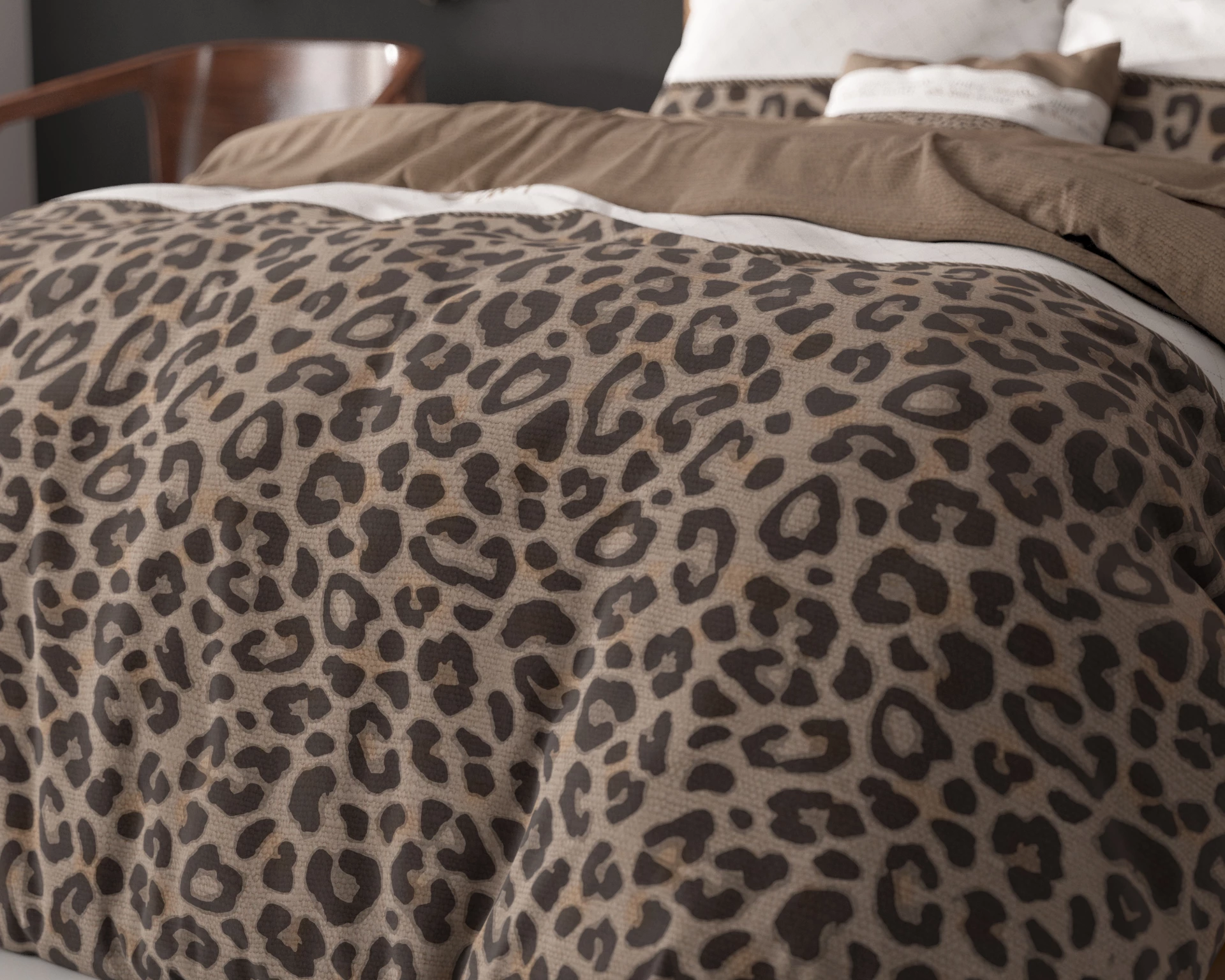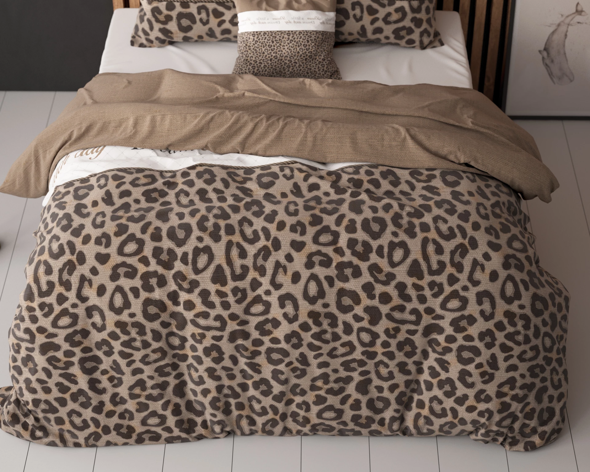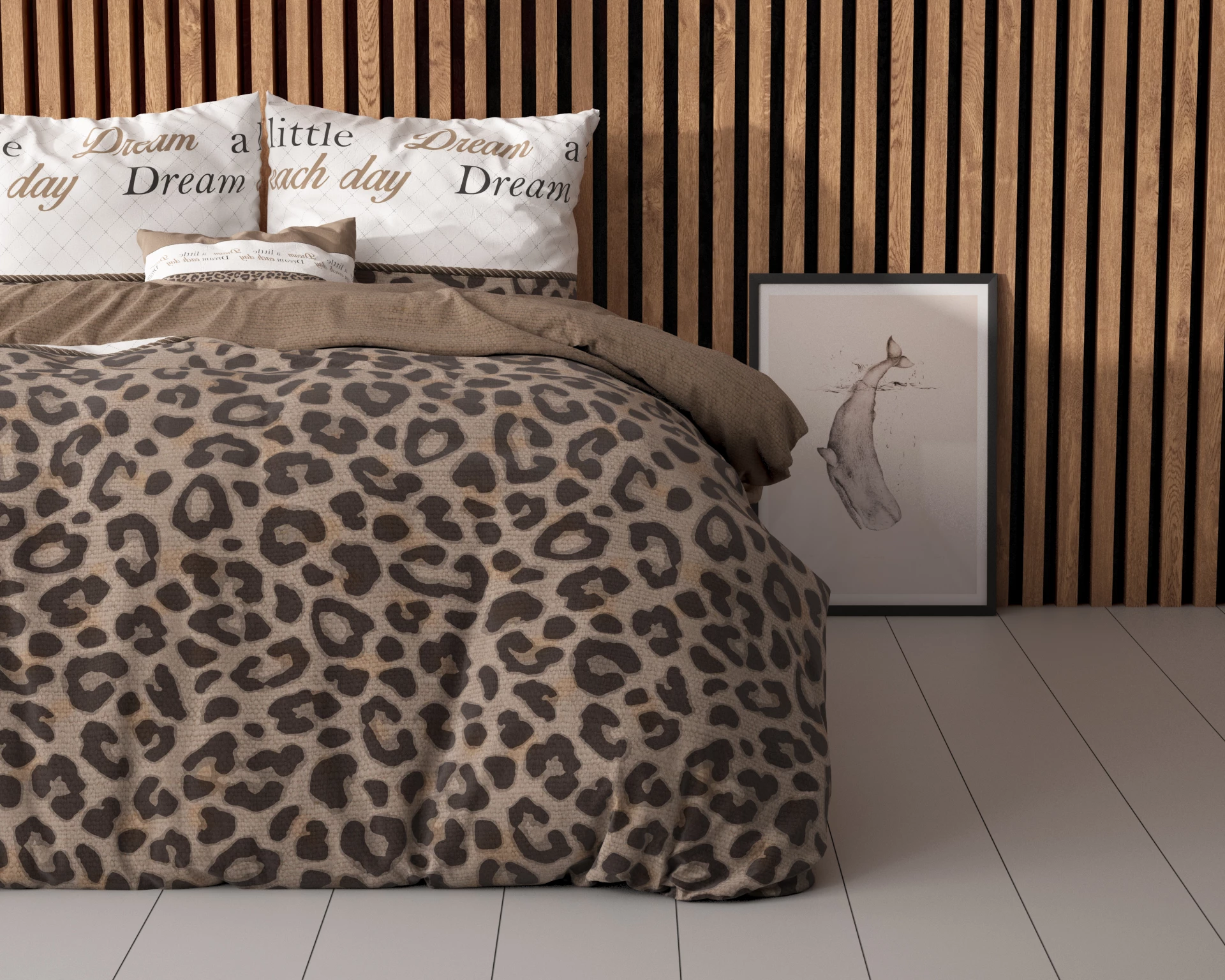 Dekbedovertrek Apeldoorn TaupenEr is niets beter dan na een drukke en vermoeiende dag in slaap vallen onder een comfortabel dekbedovertrek. Geniet van het knusse gevoel van het Dekbedovertrek Apeldoorn Taupe, dat gemaakt is van een mix van katoen!nnStijlvol en comfortabel Dekbedovertrek Apeldoorn TaupenDompel uzelf elke avond onder in dit trendy en comfortabele Dekbedovertrek Apeldoorn Taupe. Aan de ene zijde heeft het overtrek een stoere en gedurfde panterprint, terwijl de andere zijde effen is. Het overtrek is ook versierd met woorden als ‘Dream’ en ‘Sleep’. Het dessin is ook te vinden op de kussenslopen. Maak het plaatje compleet door de dierenprint te combineren met een effen wit, grijs of zwart hoeslaken. Het dekbedovertrek heeft een totale lengte van 220 cm en sluit gemakkelijk met drukknopen.nnGemaakt van hoogwaardig katoenmixnHet Dekbedovertrek Apeldoorn Taupe is gemaakt van duurzame materialen. Het bestaat namelijk uit 80% katoen en 20% polyester. Dankzij deze combinatie voelt het overtrek zacht aan, is het soepel en reguleert het de warmte. Het dekbedovertrek is warm, droogt snel, kreukt nauwelijks en gaat lang mee. Bovendien heeft het een dubbele, doorlopende instopstrook.